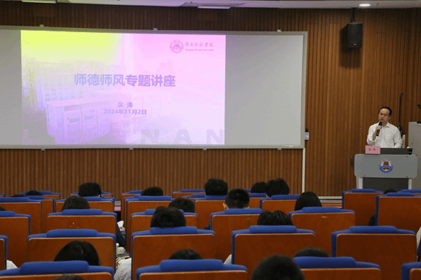 吴涛副校长以“师德师风”为核心,深刻阐述了教师职业道德的重要性。他结合“高校教师职业行为十项准则”、实际案例和学校师德师风建设情况,对师德规范进行了深入解读并向新教师提出具体要求。吴涛副校长着重解读从“四有”好老师、“四个引路人”和“大先生”到中国特有的教育家精神的不同时代要求。通过展示和分析具体案例,勉励新教师引以为戒,在未来工作中守住法律红线,守住师德底线。