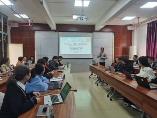 3月19日下午,教育科学学院在第四教学楼C栋四楼会议室举办“人工智能赋能教育创新”专题培训,特邀“DeepSeek等数字技术+”讲师团讲师曾绍庚作《DeepSeek:背景、技术及应用》主题讲座。学院党政领导班子、各系室教师六十余人参加。