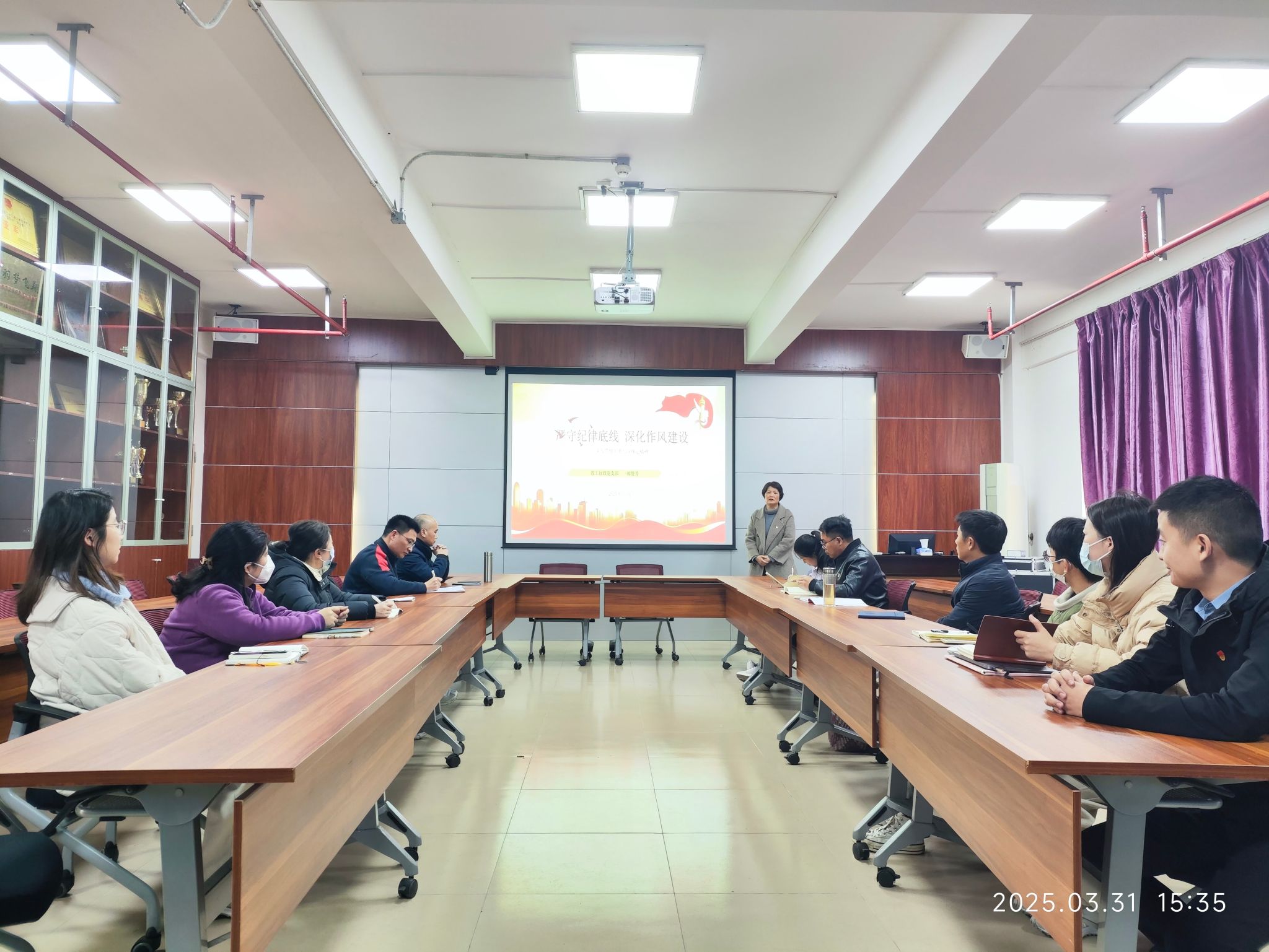 3月31日下午,教育科学学院教工行政党支部,在第四教学楼c栋408室会议室召开党员大会,学习传达《中共中央办公厅关于在全党开展深入贯彻中央八项规定精神学习教育的通知》,学习习近平总书记关于加强作风建设的重要论述;传达贯彻学校和学院深入贯彻中央八项规定精神学习教育会议精神,讨论交流支部学习教育开展。会议由支部书记郑赞芳主持。