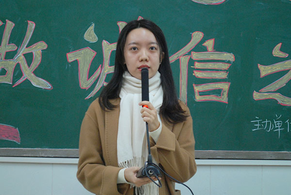 为了让同学们体会到被资助同学的感受,陈奕婷念起了优秀贷款生杨莉莉特意为此次会议书写的感谢信。信中提到杨莉莉十分感谢国家与学校,正是国家的助学贷款政策和学校的资助给了她考研的勇气,她鼓励在座的师弟师妹们敢闯敢拼,不让大学留下遗憾。而她也把握了机会顺利考上了研究生,继续了她的求学旅程。