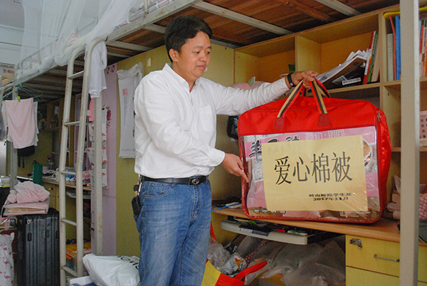 李德深副书记为学生发放爱心棉被