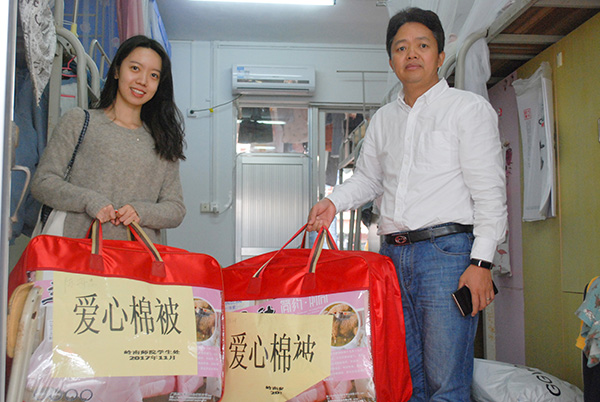 李德深副书记和黄蔚老师为学生发放爱心棉被