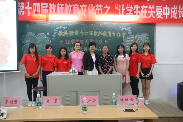 讲座期间,潘唯女与梁少云用多年来丰富的教学经验与总结的教学管理技能开展了一场精彩的讲座,让与会的同学们受益匪浅。梁少云老师在此前曾在郊区小学不计地位、不计名誉、不计时间、不计报酬,默默无闻的开展了19年的育人工作,为了学生倾注满腔热血。在讲座上,她分享了她教师育人的方法:一、用爱心浇灌它们;二、关爱学生,用童心走进他们;三、关爱学生,用诚心赏识他们;四、关爱学生,用细心观察他们;五、关爱学生,用耐心等待学生。面对梁老师的口传心授,潘唯女老师则为同学们详细补充了如何处理班级突发事件的几种解决方法,具体如下:一是热处理;二是冷处理;三是宽容法;四是应势利导法;五是寓教于喻;六是“爆炸式”教育法。为了使同学们更容易理解,两位老师都应用身边的具体事例和经典的案例为同学们仔细分析。