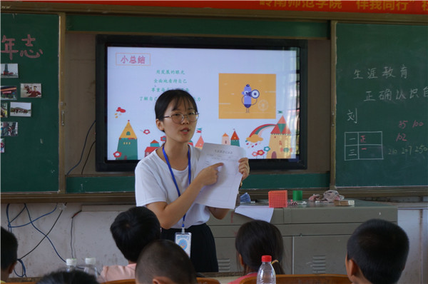 秉承我校“勤教力学,立己树人”的教育理念,结合队员的专业特点,伴我同行社会实践队坚持把发展儿童的核心素养作为教育重点,通过开展儿童史学、儿童文学、科普宣传、生活技能、交往礼仪、生涯教育、保健常识等八大主题课程,让山区儿童获得德育、智育、美育的全面提升;同时,大学生党员和入党积极分子将立德树人作为教育的根本任务,以充分的课前准备、妙趣横生的课堂、其乐融融的师生关系,给山区儿童的学习生活带来了全新的活力。甚至,精彩的课堂瞬间更被邵阳电视台记录下来,整理播放。