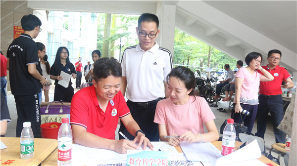 教科院领导班子莅临迎新大本营现场,详细询问17级新生报到情况。教科院领导表示“今年新生人数增多,迎新任务更加繁重,但报名处井然有序、登记速度快、效率高,这说明事前的组织筹划工作是卓有成效的”。教科院领导嘱咐迎新工作人员要使新生尽快安顿下来,以积极的心态适应大学生活,早做规划、尽快融入到岭师大家庭当中。