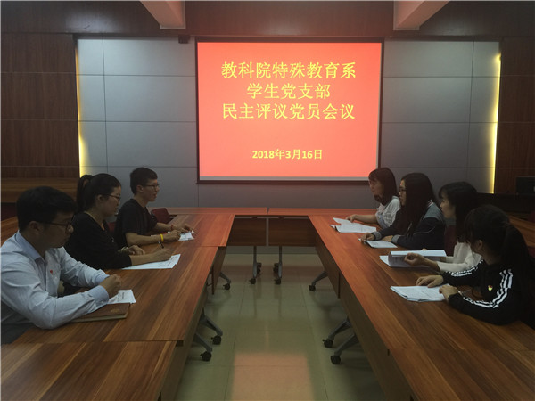 3月16日晚,教科院特殊教育系学生党支部民主评议党员会议在燕雷楼408室召开,党支部书记卢祖琴、副书记邹锦辉、组织委员关刘君、以及支部正式党员和预备党员出席了此次会议。