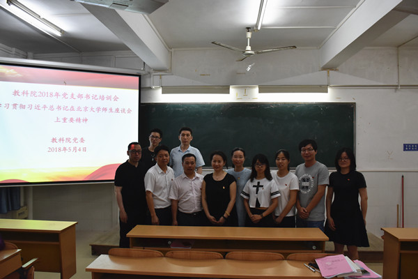 5月4日晚,教科院于燕雷楼408室举办2018年支部书记培训交流会。出席本次会议的嘉宾有:教科院党委李德深副书记、教育研究院教工支部副书记王国辉老师、教育系教工支部书记尹宁伟老师、学前教育系学生支部书记郑燕东老师、心理系教工支部副书记陈秀芹老师、教育系学生支部书记魏珂老师、特殊教育系教工支部书记伍美群老师、辅导员苏贵老师。