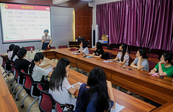 此次会议主要是针对16、17级有意愿考研的同学展开的考研交流分享会。李建兰首先为同学们介绍了考研必备的一些基础知识:不同专业对应的考研科目,常见的考试题型,列举统考与非统考学校和介绍311、312、333指定参考书等。她向同学们分享了三点考研的准备建议:一是认准考研目标,二是从现在起着手准备,有计划地复习相关书籍,三是考虑清楚自己考研是为了什么,不要盲目跟风考研。