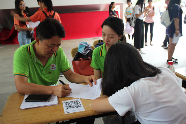 9月8日上午,我校在体育馆一楼开设“绿色通道”,接受家庭经济困难新生缓交学费申请,确保困难新生顺利入学。教科院领导班子前来绿色通道亲切慰问贫困学子,时刻关注绿色通道的情况。为了更好地帮助家庭经济困难新生办理入学,党委李德深副书记、辅导员黄蔚以及教科院勤工中心干部在现场为新生答疑解惑和指导其填写资料,