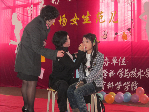 为展示现代女大学生青春靓丽、积极向上的健康形象,给女生们提供一个展现自我风采、提高个人魅力的青春舞台,3月19日,我院与化学院在风雨跑道共同举办了一场以“职场女生范儿”为主题的职业形象设计大赛。嘉宾玫琳凯连锁店的两名专业化妆师与尚艺发型屋的两名资深发型师作为专业评委出席本次大赛。