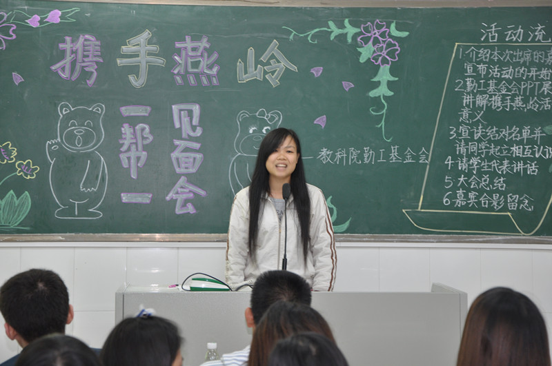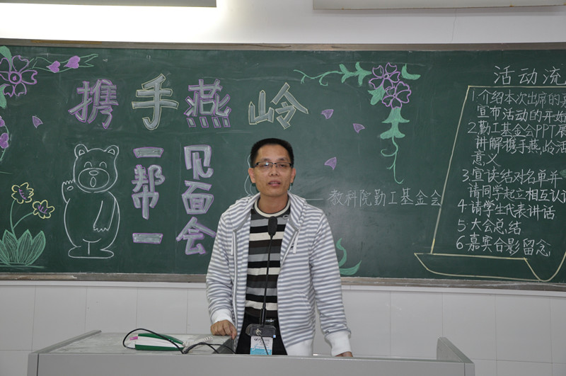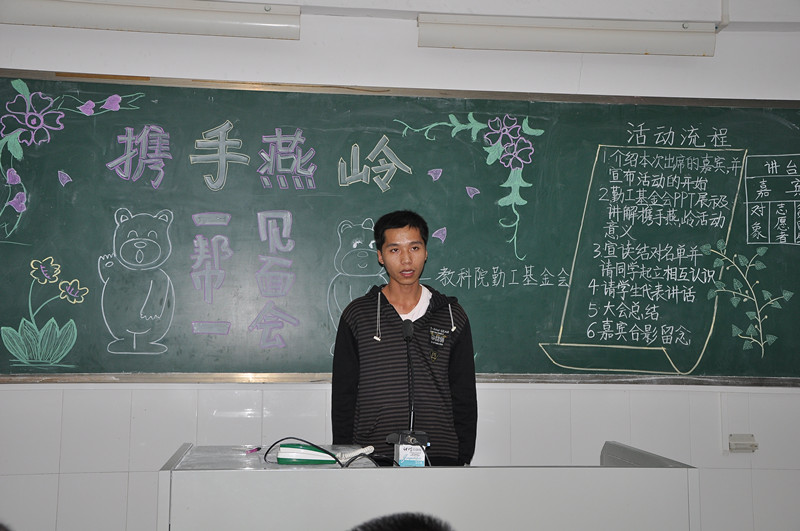 11月10日晚上,教科院勤工服务部在燕雷楼举行携手燕岭“一帮一”见面会。出席本次见面会的有教科院党委郭和才副书记,辅导员魏珂老师,校勤工干部以及“携手燕岭”的队员和志愿者。本次见面会举办的目的是让11级的贫困新生有一个和09、10级的优秀师兄师姐互相认识、学习的机会,增强彼此之间的感情。