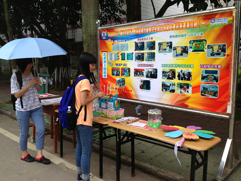 5月11日,教科院在音乐厅门前举办了第九届师范生综合技能大赛成果展。展览分为展板展示和实物展示两大部分,再现了本届大赛历时两个多月、十个分项目的激烈角逐,展现了大赛的各项成果,表现了师范文化的魅力,反映了教科院师生协力育师德,同心锻师能、铸师魂的良好育人氛围。展板展示区五块不锈钢展板展示了大赛九年的办赛历程、本届大赛班级积分榜及本届大赛语言类、应用类、艺术类和综合类四个大类、十大项目比赛的现场照片和作品。实物展示区主要展示了大赛之现场教具制作大赛中制作的优秀作品和获奖教案、说课稿、演讲稿供全校师生参观指导。