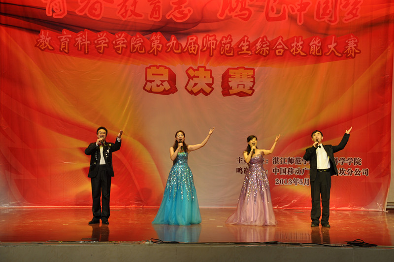 晚会的尾声,四名在湛师参加中职骨干教师国家级培训的学员代表为大赛带来表演歌曲《阳光路上》。在宛转的歌声中,教科院第九届师范生综合技能大赛总决赛圆满落幕。