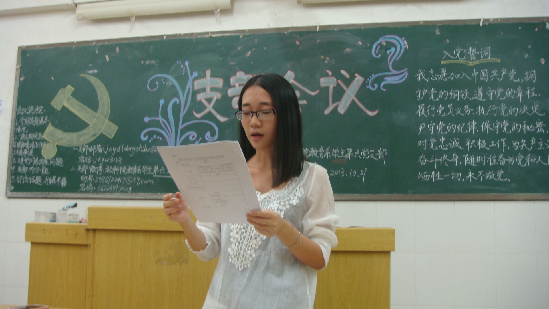 会上,支部书记肖东阳介绍了本支部的基本情况,教科院教育系学生第六党支部由3名正式党员和9名预备党员组成,支部成员品学兼优,学习和工作能力强,思想觉悟高,且大部分同志是学院的曾任或现任干部。紧接着,支部书记就学院所开展的“第五期党员后续教育培训班”,进行了“微博时政学习”以及“读书分享活动”的任务安排,并进行了相关事项的讲解。最后,支部书记指出支部内建党对象的发展问题并进行了支部内小组的划分,大大加强了支部的建设与管理。