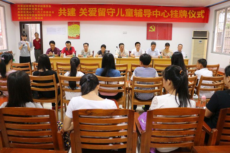 5月10日上午,由共青团赤坎区委员会、赤坎区关心下一代工作委员会、赤坎军休所、共青团岭南师范学院委员会、教科院教育系学生第五党支部共建的“关爱留守儿童辅导中心”在赤坎军休所正式挂牌并举行揭牌仪式。