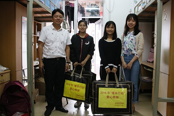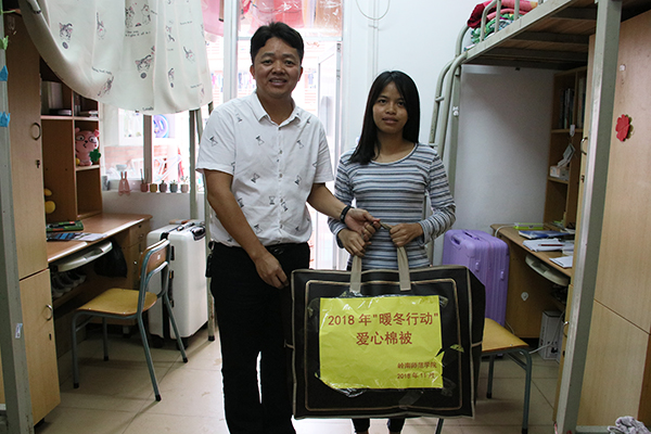 冬季悄然至,温暖已出发。随着天气日渐变凉,为了让同学们渡过一个温暖的冬天,教科院积极配合学生处工作,及时开展2018年“暖冬行动”御寒棉被赠送工作。12月3日早上,教科院党委李德深副书记、黄蔚老师以及教科院勤工中心干部走进学生宿舍,为家庭经济困难新生赠送御寒棉被,让他们感受冬日里的关怀与温暖。