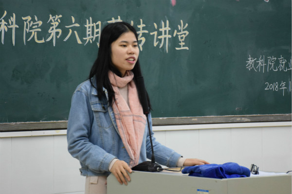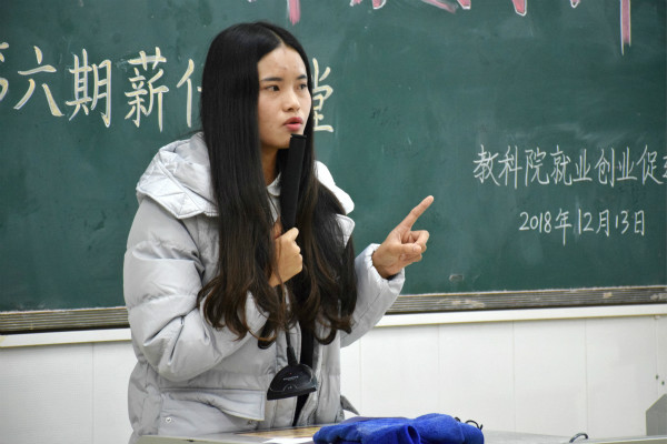 为给同学们提供一个与毕业师姐交流的机会,让同学们近一步了解就业和工作生活的经验,教科院就业创业促进中心于12月13日在第四教学楼501室举办主题为“金风吐睿,锦囊探计”第六期薪传讲堂。出席本次活动的嘉宾有:13心本2班的龙瑜、13学前1班的梁家喜和13特教的李青霞。