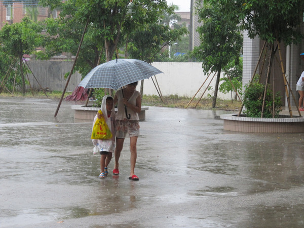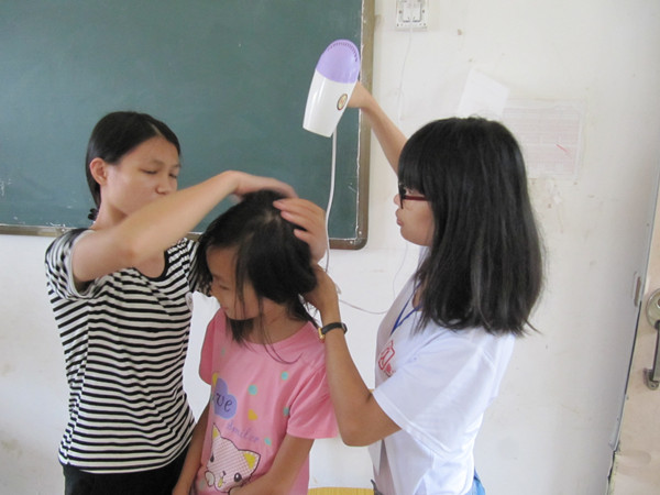 中午实践队队员们在宿舍休息时被一声“老师,下雨啦!快收衣服!”惊醒。当队员们起来打算收衣服时一些学生已经抱着收好的衣服上来了队员们的宿舍。原来他们都是提前了半个小时来学校的学生,在等待上课的过程中看到快下雨了便来告诉老师和帮老师们收衣服。小老师们看着窗外滂沱的大雨,看着被雨水淋湿的学生,眼泪不禁夺眶而出。感动还在延续,陆陆续续地有学生冒着大雨来学校上学,队员们拿出吹风机帮学生们吹干淋湿的头发和衣服,场面温馨和睦。