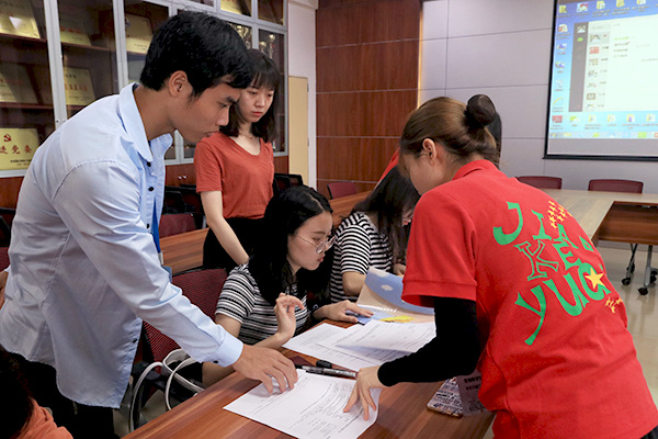黄蔚老师和干部一起指导学生填写资料 (吕晓莹摄)