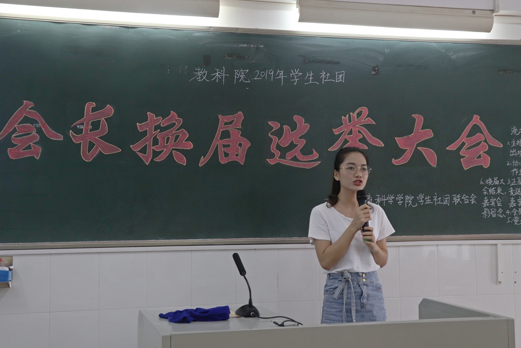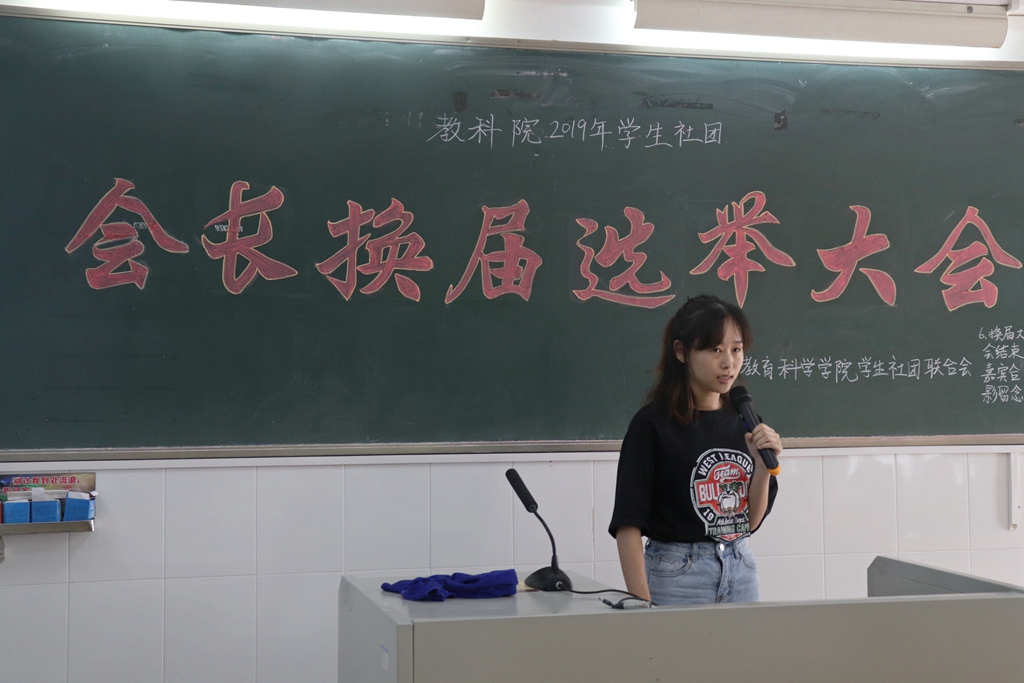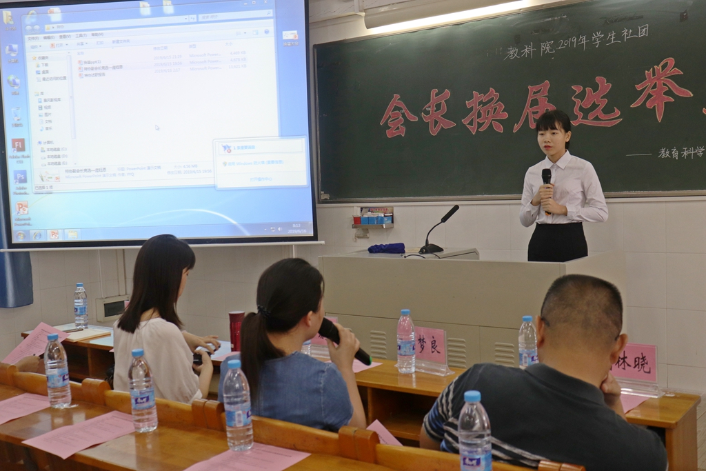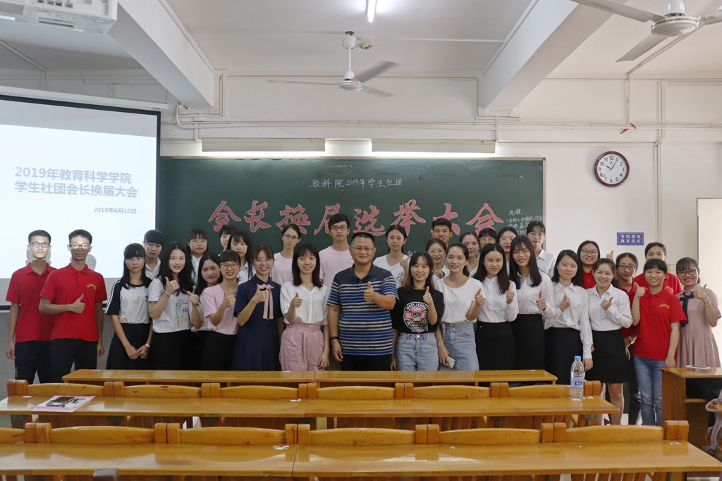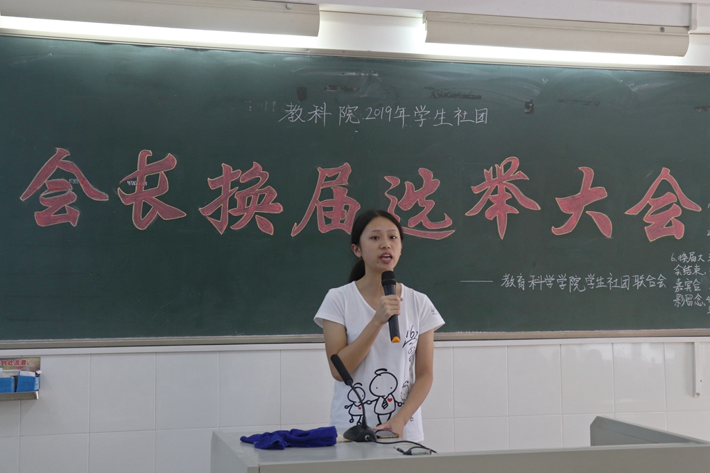 6月16日早上,教科院学生会社团部于教四706举办2019年学生社团会长换届选举大会。儿童围棋教育协会指导老师钱林晓、特殊教育协会指导老师石梦良、手工制作协会指导老师卢祖琴、社团分管老师黄蔚以及校社联干部出席了本次换届选举大会。