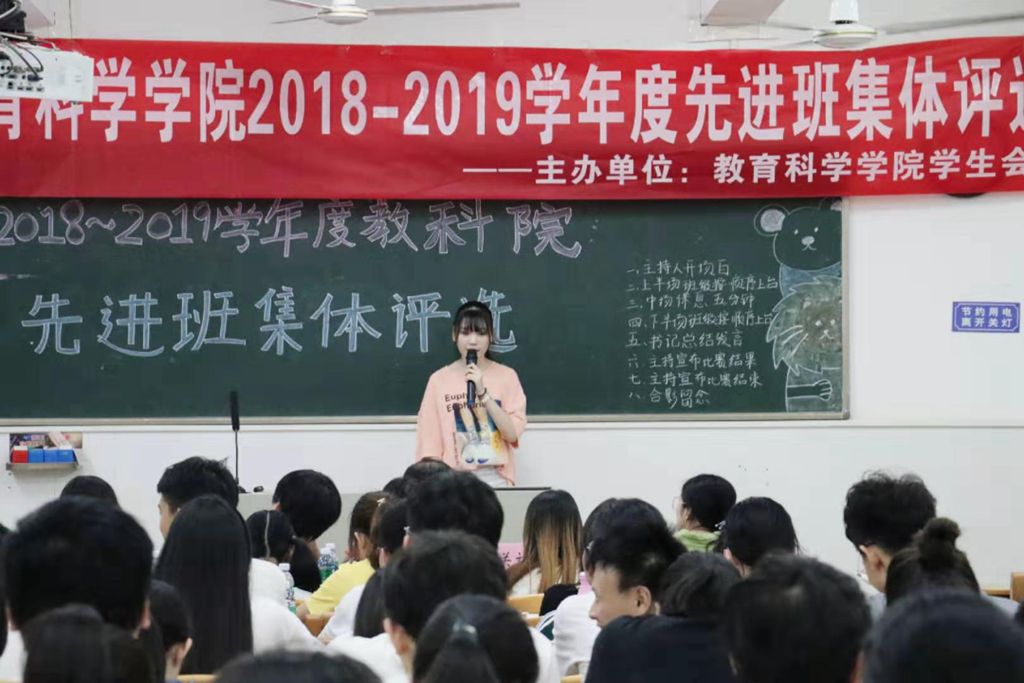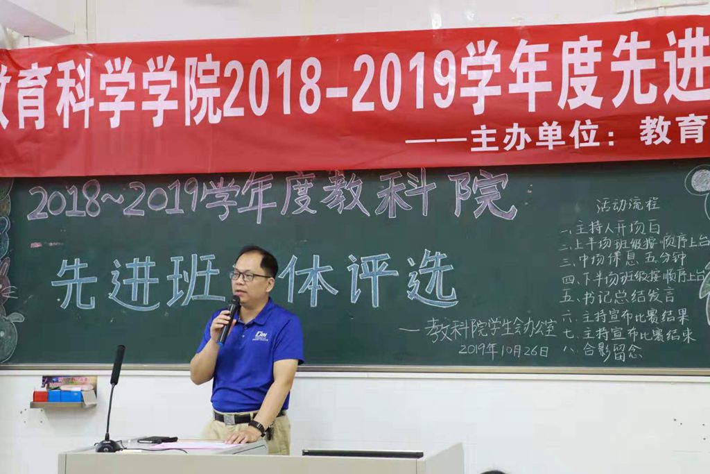 10月26日晚,教科院于第四教学楼C栋605室举办2018-2019学年度先进班级集体评选活动。教科院党委副书记林志军、辅导员苏贵老师、关刘君老师、谭诗蔚老师、李水清老师和本院学生机构代表及外院学生机构作为嘉宾评委共同出席了本次活动。