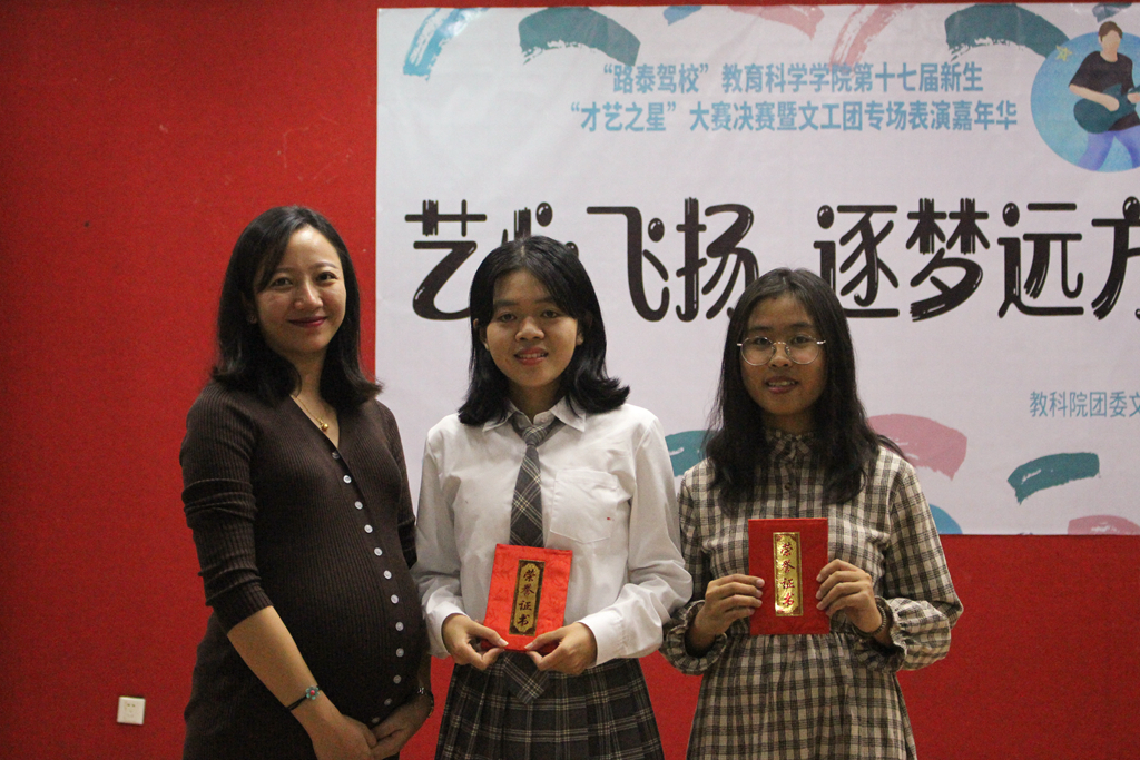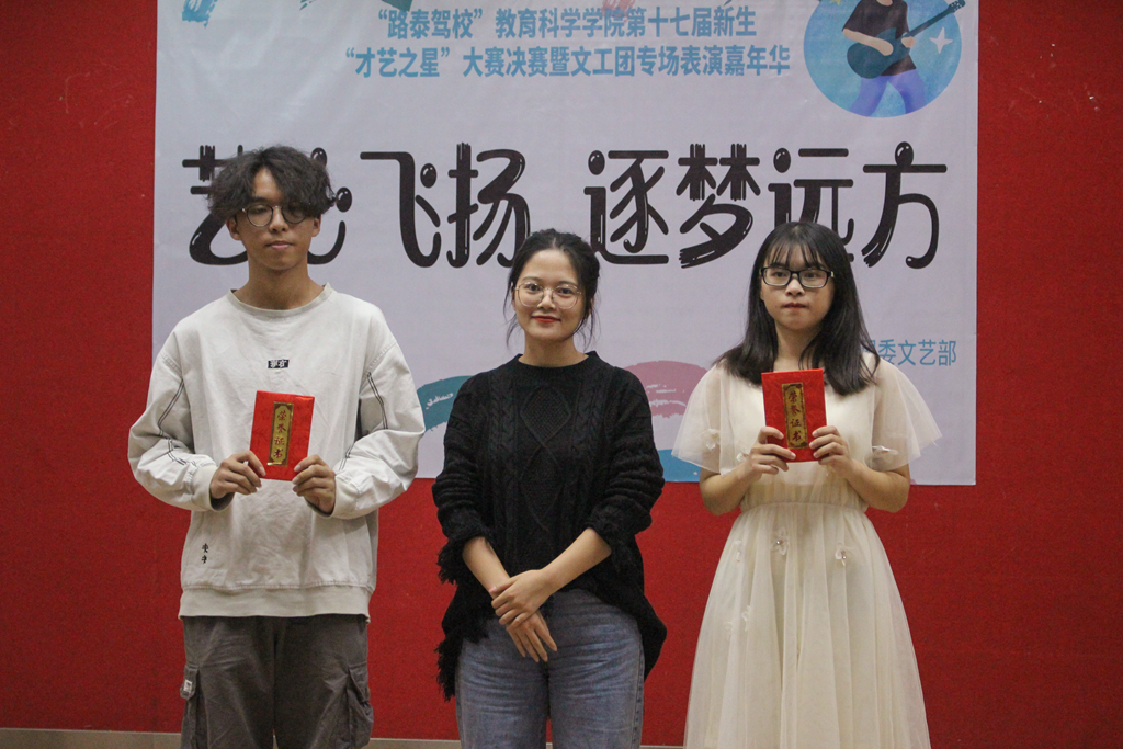 11月30日晚,教科院团委文艺部在鸿园420多功能舞蹈室举办了主题为“艺心飞扬、逐梦远方”的“路泰驾校”教科院第十七届新生“才艺之星”大赛决赛暨文工团专场表演嘉年华。出席本次大赛的评委和嘉宾有教科院学前教育系袁铱琳老师、陈舒怡老师、辅导员关刘君老师、李水清老师。