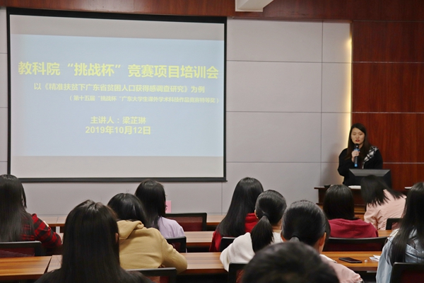10月12日晚,教科院在第四教学楼408会议室召开“挑战杯”竞赛项目培训会。教科院团委负责人关刘君老师、教科院19级各班学生代表参加本次会议。培训会由第十五届“挑战杯”广东大学生课外学术科技作品竞赛特等奖获得者代表梁芷琳主讲。