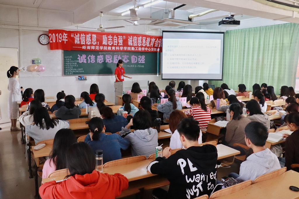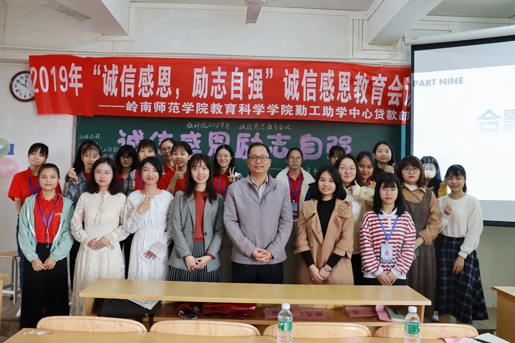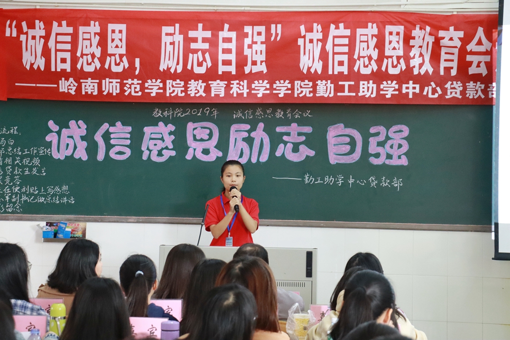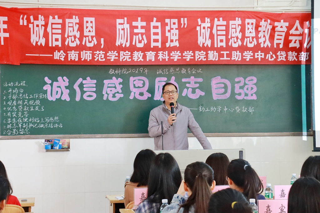 12月15日上午,教科院勤工中心在燕雷楼401室召开了以“诚信感恩,励志自强”为主题的诚信感恩教育会议。莅临本次会议的嘉宾有教科院党委副书记林志军、辅导员黄蔚老师、各二级学院勤工中心干部以及教科院勤工中心主任陈丁宁,自强社干部邓冰冰。教科院各班贫困生负责人和部分贷款生出席了本次会议。