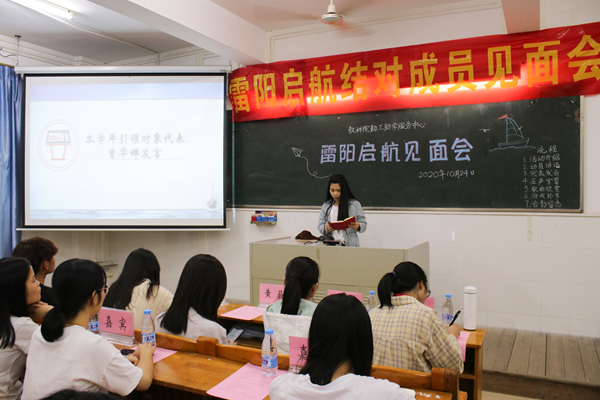 10月24日晚,教科院勤工助学中心于教四C栋604举办了2020年“雷阳启航”结对引领见面会,教科院勤工中心指导老师黄蔚、勤工中心主任黄海玉、自强社干部及各二级学院干部代表、引领队员及对象代表、教科院18、19、20级学生共同出席本次活动。