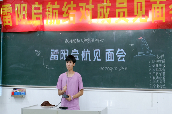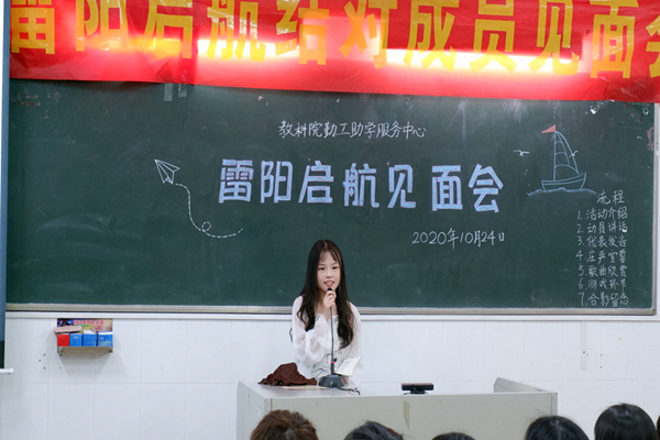 勤工助学中心基金会干部陈晓嘉介绍此次“雷阳启航”活动及基金会的主要工作并对上一年的工作做出总结与反思。上一年优秀结对队员黄婉玲分享了她和帮扶师姐的经历,展示了她与帮扶师姐在线上线下的交流情况,并表示她会努力地将感受到的温暖继续传递下去。本学年的引领对象代表曾华婵讲述她对加入“雷阳启航”活动的展望。引领队员黄文涛分享他对此活动的期望以及提出活动需要改进的部分。