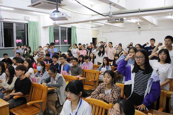 引领队员钟凯祈和新生代表苏柏榕带领大家进行宣誓。在声乐队代表演唱《小幸运》后,引领队员和对象们共同参与“眉目传情”、“背后画图猜猜猜”等游戏环节,现场气氛热烈,结对队员间培养了默契度、增进了对彼此的了解。
