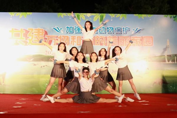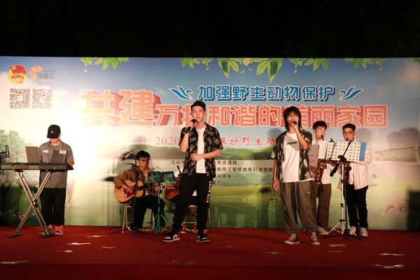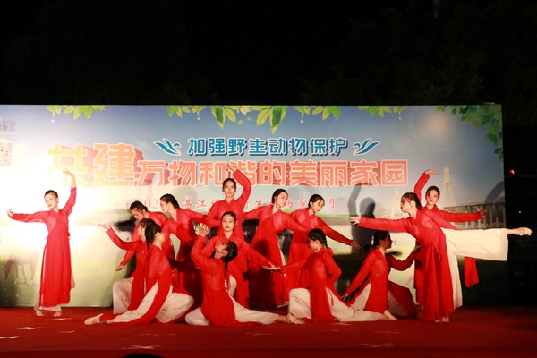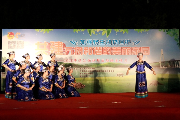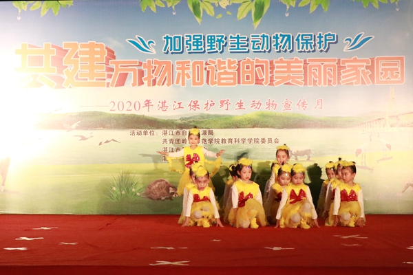 启动仪式上,健美操队的热场表演伴随着动感的旋律,给观众们展现了轻盈的舞姿,点燃了现场的气氛;教科院声乐队带来的歌曲《我的梦》表明了保护野生动物责任之大;岭南师范学院附属幼儿园小朋友以舞蹈表演《鸟儿》的形式展现了鸟儿在蓝天自由飞翔的美好画面;教科院朗诵队通过朗诵《大自然的奇妙精灵》表示了盗猎者之无情,发出对盗猎者的控诉,增强人们保护野生动物的意识;教科院19学前1班和19学前2班团支部带来的舞蹈《大鱼》,舞者在灯光下用柔和优美的舞姿给观众带来一阵阵视觉上的冲击与享受;教科院话剧队小品表演《对伤害穿山甲说“不”》讲述了警官与贩卖穿山甲的违法人员斗智斗勇的故事,强调了市民们保护野生动物义不容辞;教科院礼仪队带来的走秀展《万物生长》,她们自信的走姿与站姿有着诗一样的魅力和梦幻般的美,把春天的生机勃勃展现地淋漓尽致;音舞院学生代表表演的乐器弹唱《Mojito》节奏浪漫轻快,仿佛置身于野外,感受着大自然的亲昵;教科院舞蹈队的舞蹈表演《银蝴蝶》以轻盈而有力的节拍表达了对蝴蝶诚挚的敬意。志愿者代表邱芷君宣读《保护野生动物倡议书》,她呼吁广大市民行动起来,伸出双手,献出爱心,以实际行动珍爱野生动物,保护绿色家园。