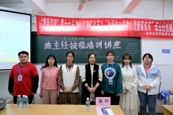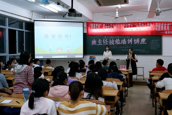 12月12日晚,教科院学生会教师技能实训部于教四C栋412室举行了“路泰驾校”第十七届教师教育文化节之“加强中小学生心理健康教育”班主任技能培训讲座。此次讲座由湛江市第十六小学一级教师吴妍主讲,教科院学生会主席郑嘉汉、教科院学生会轮值主席颜箢、教科院学生会宣传干部张慧琪和18-20级部分学生共同出席了此次讲座。