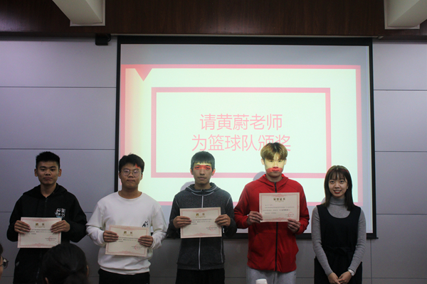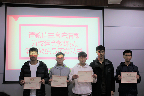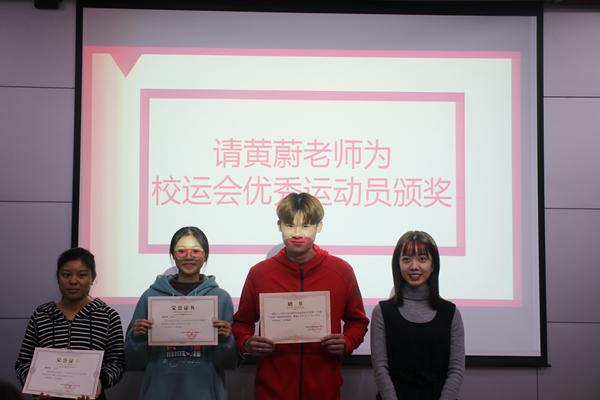黄蔚向“三好杯”篮球赛男子篮球队、校运会获奖运动员和优秀运动员谢秋铃、胡光鑫、黄路瑶颁发奖状;郑嘉汉向校运会教练员、篮球教练员颁发聘书并向优秀医护人员熊海潮、蒙泽锋,优秀教练潘正浩、梅锦俊、陈佩婷颁发奖状;陈浩霖向20小教3班以及20小教4班的体委颁发优秀组织奖。