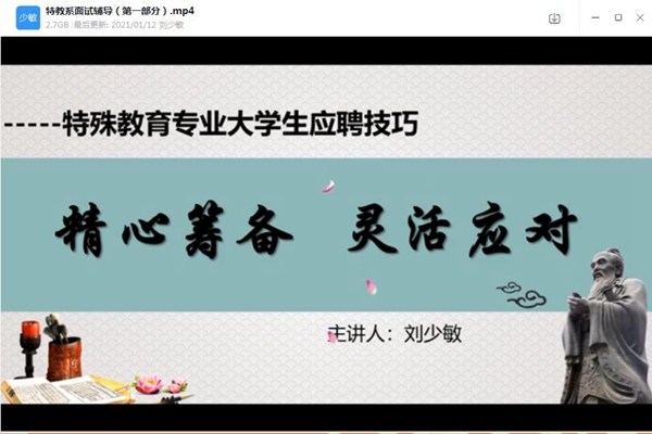 1月12日,教科院特殊教育系以线上的形式开展教师就业面试技巧辅导会议。特教系副系主任杨溢老师、胡永崇老师,17级,18级特教专业学生160余人参加此次会议。本次会议由湛江特殊教育学校刘少敏校长主讲。她以“精心筹备,灵活应对”为主题,针对特教学校面试考核的内容,流程,应聘技巧,注意事项等方面进行辅导,旨在帮助特教专业学生做好面试前期准备,顺利找到理想的工作。