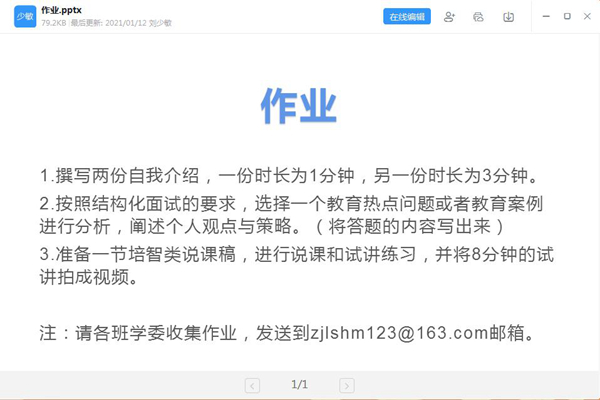 第四、熟知考核的内容及技巧。她表示考核多是笔试或面试形式。其中面试考核以自我介绍、结构化问答、说课、讲课和无领导小组讨论的方式来考察学生的综合能力。在讲解自我介绍环节时,她播放了央视主持人大赛参赛者邹韵的自我介绍演讲,以此说明在求职面试时应该加强优势讲述、注意时间掌控和肢体语言表达,切忌出现思路混乱、没有自我和死记硬背等情况。同时在结构化问答的环节中,她除详细介绍考核流程外,还以四个案例讲解了该环节的答题技巧。在讲课的环节中她提出了模拟课堂进行讲课、板书应整洁、语言应有亲和力、教学方法应符合学生特点的四点注意事项。