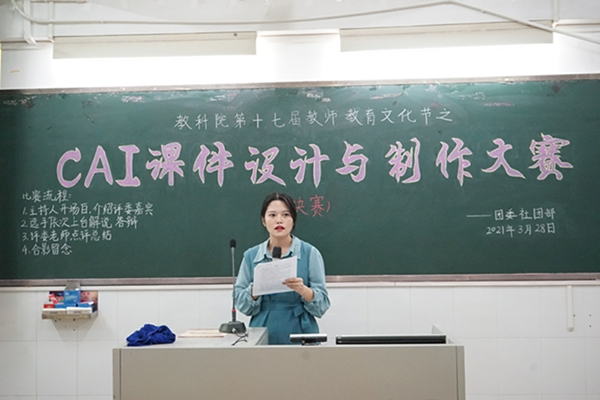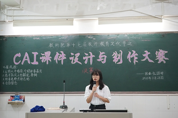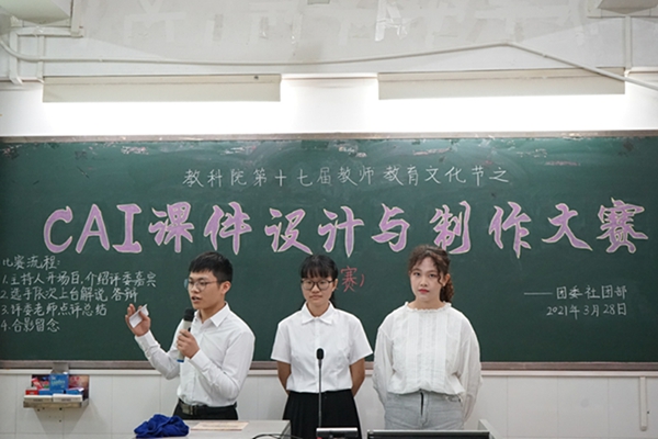 课件是教学活动中的一个重要载体,为帮助师范生积累课件设计与制作经验,提高教学基础能力,3月28日晚,教科院于教四412室举办第十七届教师教育文化节之CAI课件设计与制作大赛决赛。本次比赛由教科院团委社团部主办,教科院陈友南、李水清老师作为评委嘉宾出席了本次比赛。