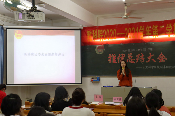 4月10日晚,教科院在第四教学楼604室举行了2020-2021学年第二学期推优总结大会。教科院团委负责人朱丽儒、教科院团委秘书团干部、党建干部、信息院组织部干部及各支部团支书、推优代表共同出席本次会议。