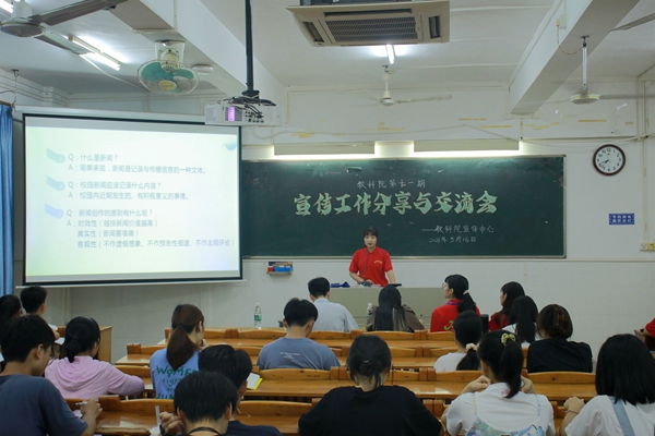 随后宣传中心编辑部部长陈慧因从新闻的六要素、新闻写作的基本要求及常见类型三方面进行稿件写作培训,同时她还介绍了其他的宣传形式,拓宽了宣传工作者的宣传途径。摄影部部长刘光球则从摄影构图技巧、艺术哲学、摄影历史发展、审美安利等内容进行分享。宣中副主任郑怡做“优秀宣传班集体”评优细则讲解并并总结近段时间上有关宣传方面的问题。