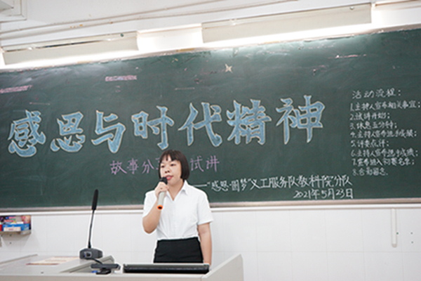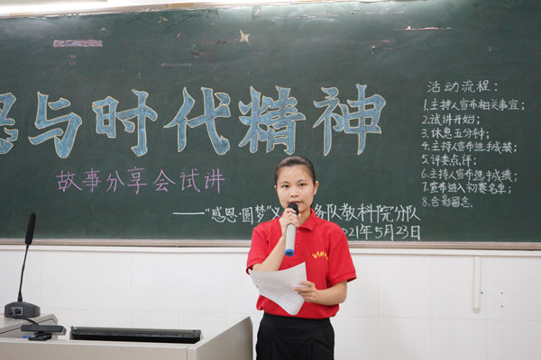 5月23日晚上,教科院勤工助学中心于教四C举办2021年“感恩与时代精神”故事分享会试讲比赛。勤工助学中心主任黄海玉、勤工助学中心副主任高佩祺、勤工助学义工部部长邱晓晴作为本次比赛的评委,19、20级各班学生代表出席本次比赛。