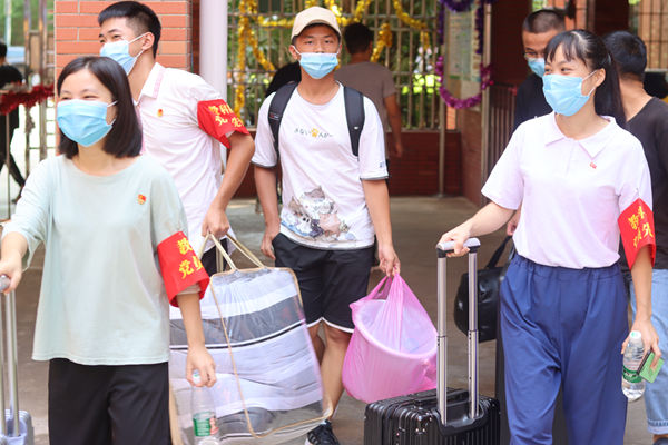 志愿者帮助新生入住(黄丝敏摄)