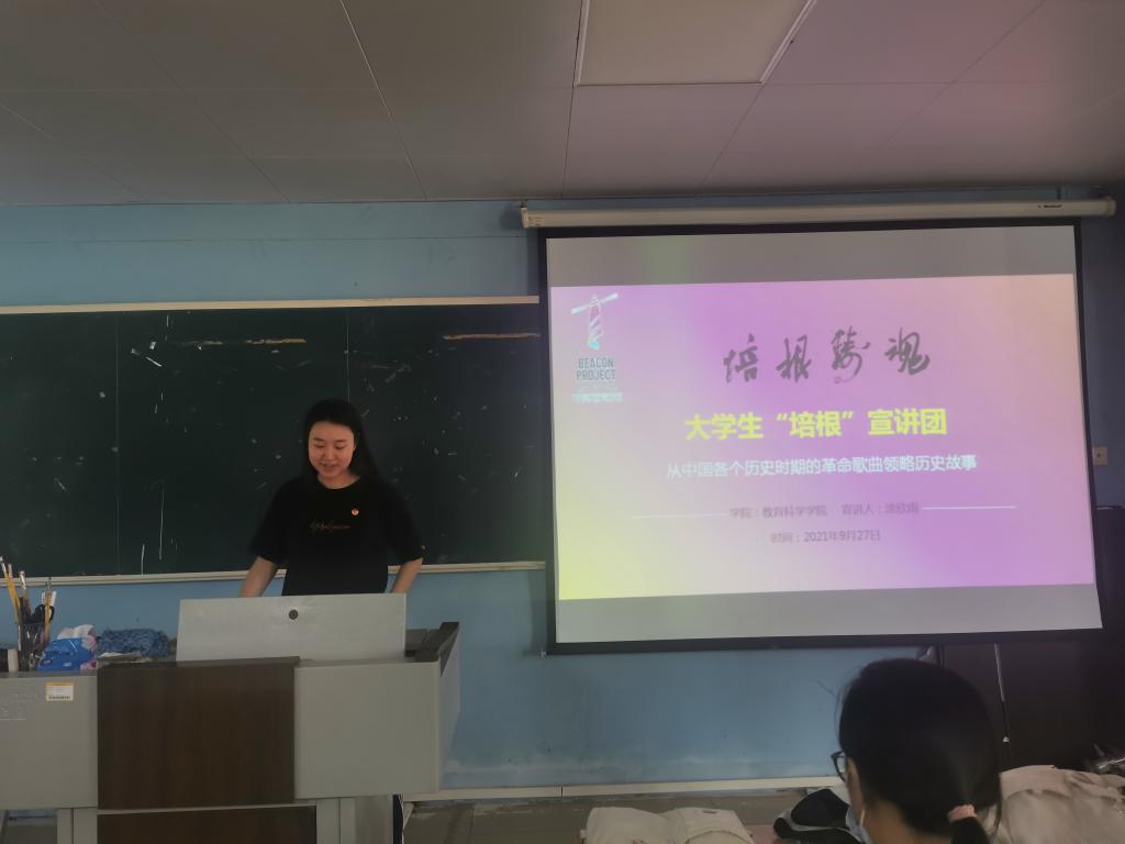 紧接着开始“培根”宣讲环节,涂欣雨以“从中国各个历史时期的革命歌曲领略历史故事”为主题开展本次宣讲,即从每一个历史阶段选取一道两首红歌,由歌曲入手讲述歌曲背后的历史故事,并组织教学红歌,宣讲结束齐唱红歌。