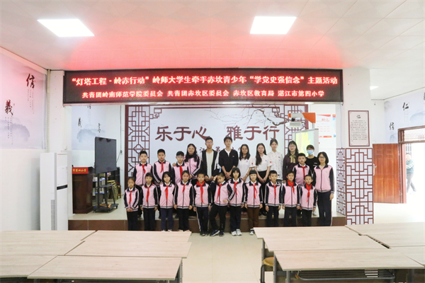 11月15日上午,岭南师范学院大学生“培根”宣讲团在湛江市第四小学举行“灯塔工程•岭赤行动”岭师大学生手牵手赤坎青少年“学党史强信念”主题活动。本次宣讲由岭师大学生“培根”宣讲团成员黎欢娴主讲。