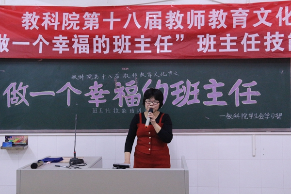 12月12日晚,教科院学生会学习部于教四C栋412室举行了第十八届教师教育文化节之“做一个幸福的班主任”班主任技能培训讲座。教科院正级处组织员郑赞芳、湛江市第六小学副高级教师李燕老师、教科院教育系魏珂老师共同出席了此次讲座。