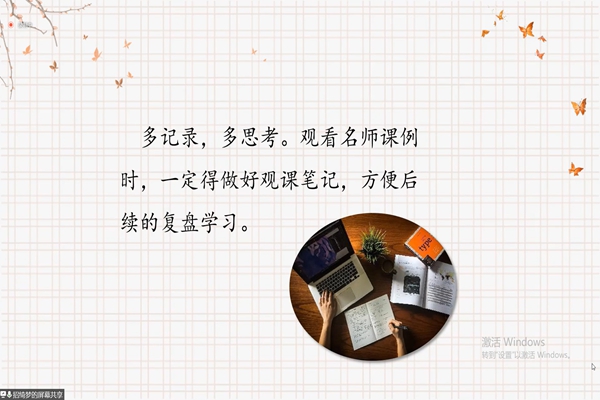 “专业是立身之本”。招绮梦以此引出要扎实专业知识,并表示在职场之中专业知识与专业技能的重要性。她为掌握扎实的专业知识提供了以下方法:一要看名师课例,听名师讲座,她向我们展示了十多本记录自己所学、所思、所想的手写笔记并介绍了一种做笔记的方法“七三法”;二要看书;三要参加教研活动;四要做好寒暑假计划。招绮梦讲述了她在名师荟萃的千人会场里首个发言的故事,并表示新教师就是要有敢于发言的胆量。