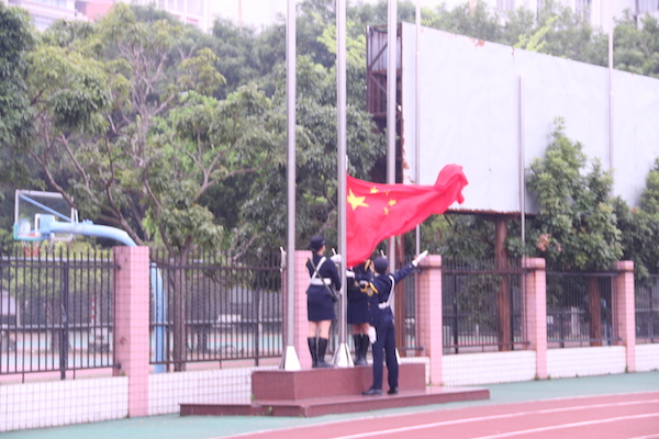 升旗仪式于7点10分准时开始。在庄严的音乐中,国旗护卫队踏着整齐的步伐护送着鲜艳的五星红旗缓缓走向升旗台。神圣庄严的国歌奏起,五星红旗随着节奏冉冉上升。老师同学们无不呈肃立姿势,奏唱国歌,对国旗行注目礼,向祖国表达自己真挚的热爱。国歌唱完,五星红旗迎风飘扬,全体师生们对祖国的自豪和骄傲油然而生。
