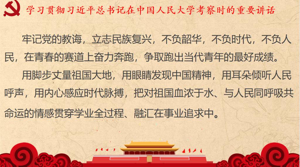 杨粤栋介绍会议流程,包括预备党员进行读书汇报和现场抽问相关知识两个环节。在第一议题学习环节,预备党员陈泱羽和邱晓晴学习汇报“习近平总书记在中国人民大学考察时的重要讲话”。陈泱羽从重要讲话的时代背景与五大重点内容两方面进行汇报,并分享了学习感悟。一要牢记党的教诲,跑出当代青年的最好成绩;二要把对祖国血浓于水、与人民同呼吸共命运的情感贯穿学业全过程、融汇在事业追求中。