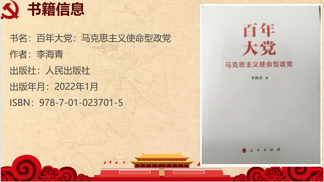 预备党员杨粤栋作《百年大党:马克思主义使命型政党》读书汇报,向大家介绍了书籍信息和章节内容,并就书籍内容进行观点提炼,一是何为马克思主义使命型政党;二是使命型契约的建立及党民伦理;三是政党的自主性和领导核心。