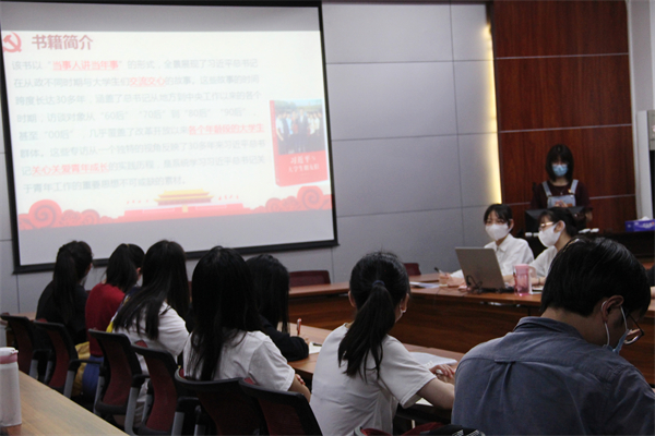八位学生预备党员依次作《习近平与大学生朋友们》的读书汇报,其中还设置了党史学习知识随机抽取问答的环节。学生预备党员以章节为要点向大家介绍了书籍的简要信息,并就其内容进行观点陈述。陈惠提到,该书以“当事人讲当年事”的形式,全景展现了习近平总书记在从政不同时期与大学生们交流交心的故事,是系统学习习近平总书记关于青年工作的重要思想不可或缺的素材。邓梦婷表示,她在阅读“习近平总书记勉励我们做党和人民满意的‘四有’好老师”这一部分时感悟颇深,她从中得到了“一个优秀的老师,应该是‘经师’与‘人师’的统一,既要精于‘授业’和‘解惑’,更要以‘传道’为使命”的启发。同时,她倡议作为未来教师的师范生心中要有国家和民族,要明确意识到自己所肩负的国家使命和社会责任,勇做新时代的奋进者、开拓者和奉献者。钟晓嫣从书中的“习近平总书记与我们一起过‘主题团日’”部分总结出了五个青年学生成长锦囊:一是树理想,早立志向明确人生航向;二是抓学习,惜时如金自觉汲取知识;三是掌方法,创新思维勇于开拓实践;四是自雕琢,雕琢自己培养高洁品行;五是苦磨砺,迎难而上正确对待成败得失。