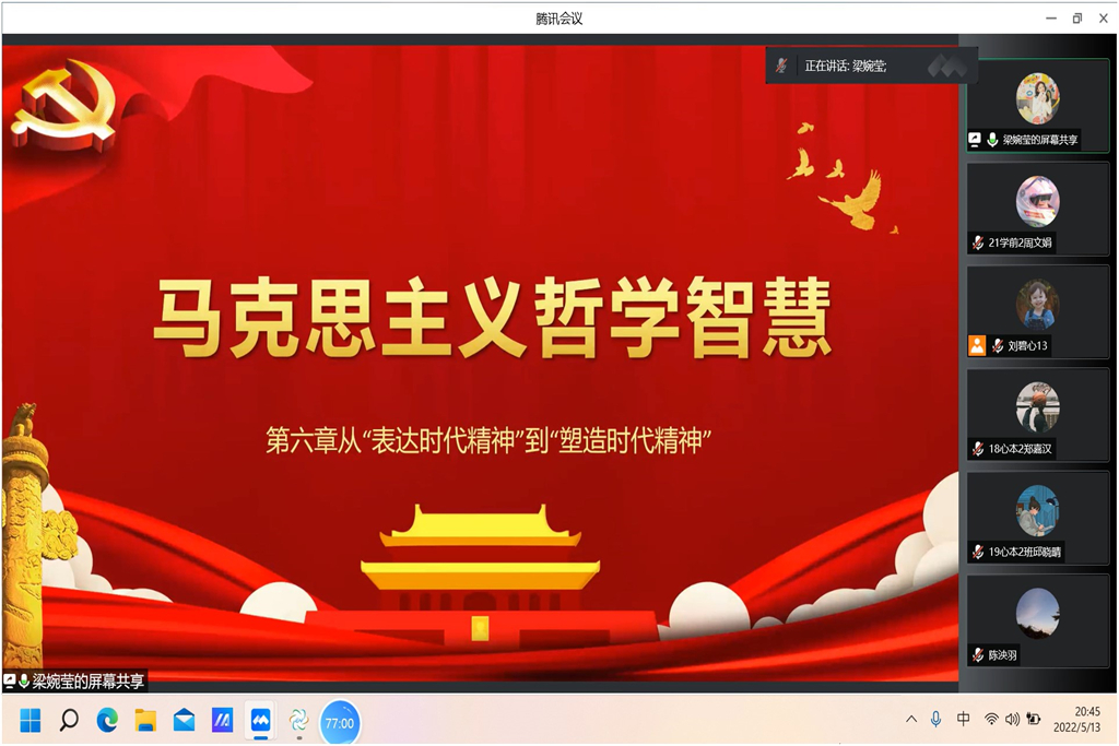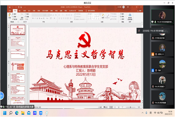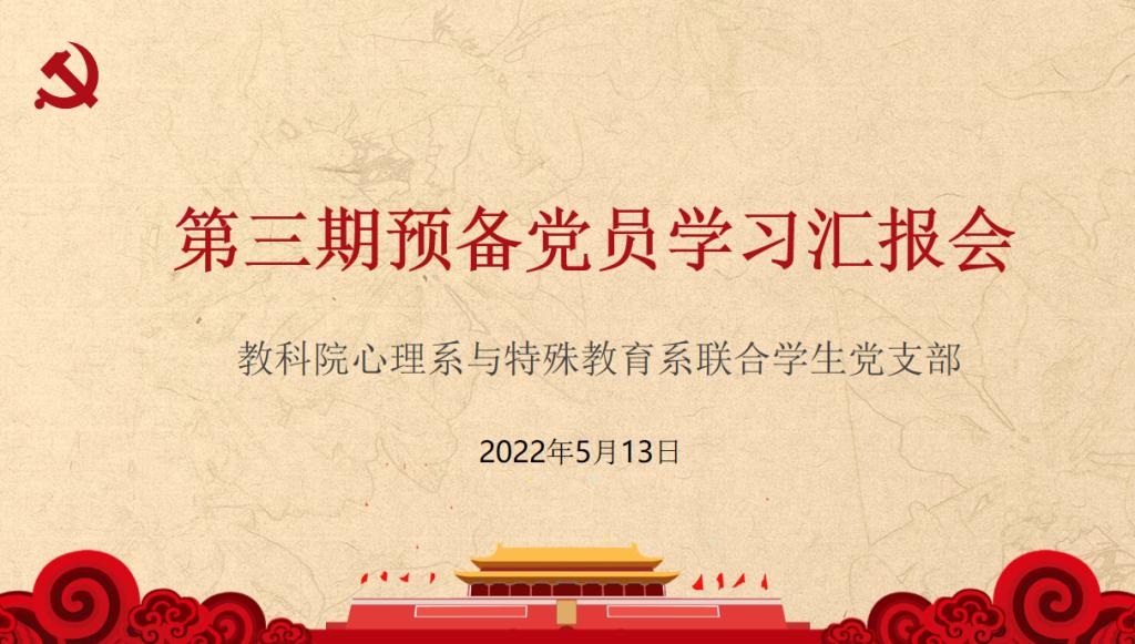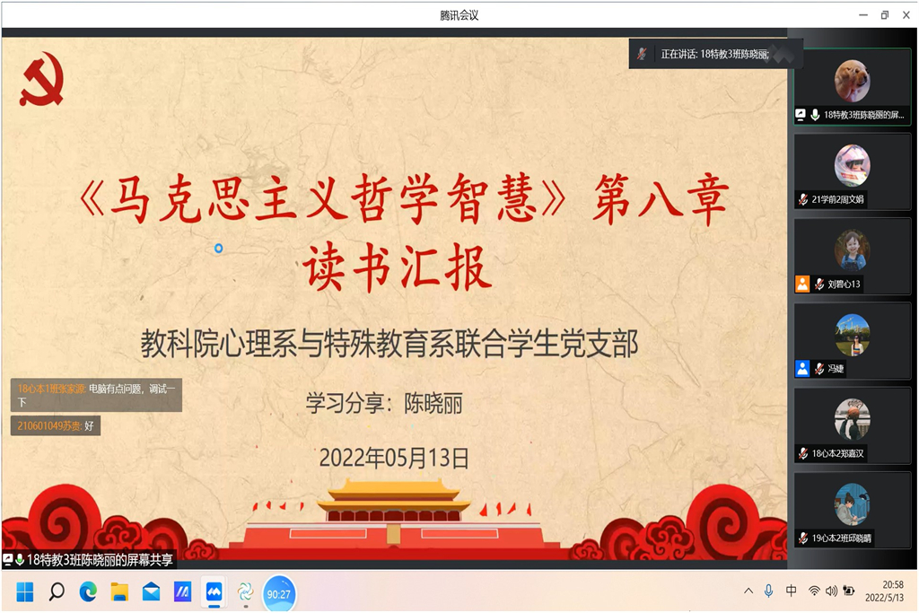5月13日晚,教科院心理系与特殊教育系联合学生党支部利用腾讯会议形式举办预备党员第三期学习汇报会。教科院正处级组织员郑赞芳、心理系与特殊教育系联合学生党支部书记苏贵老师、全体正式党员、预备党员参加本次会议。